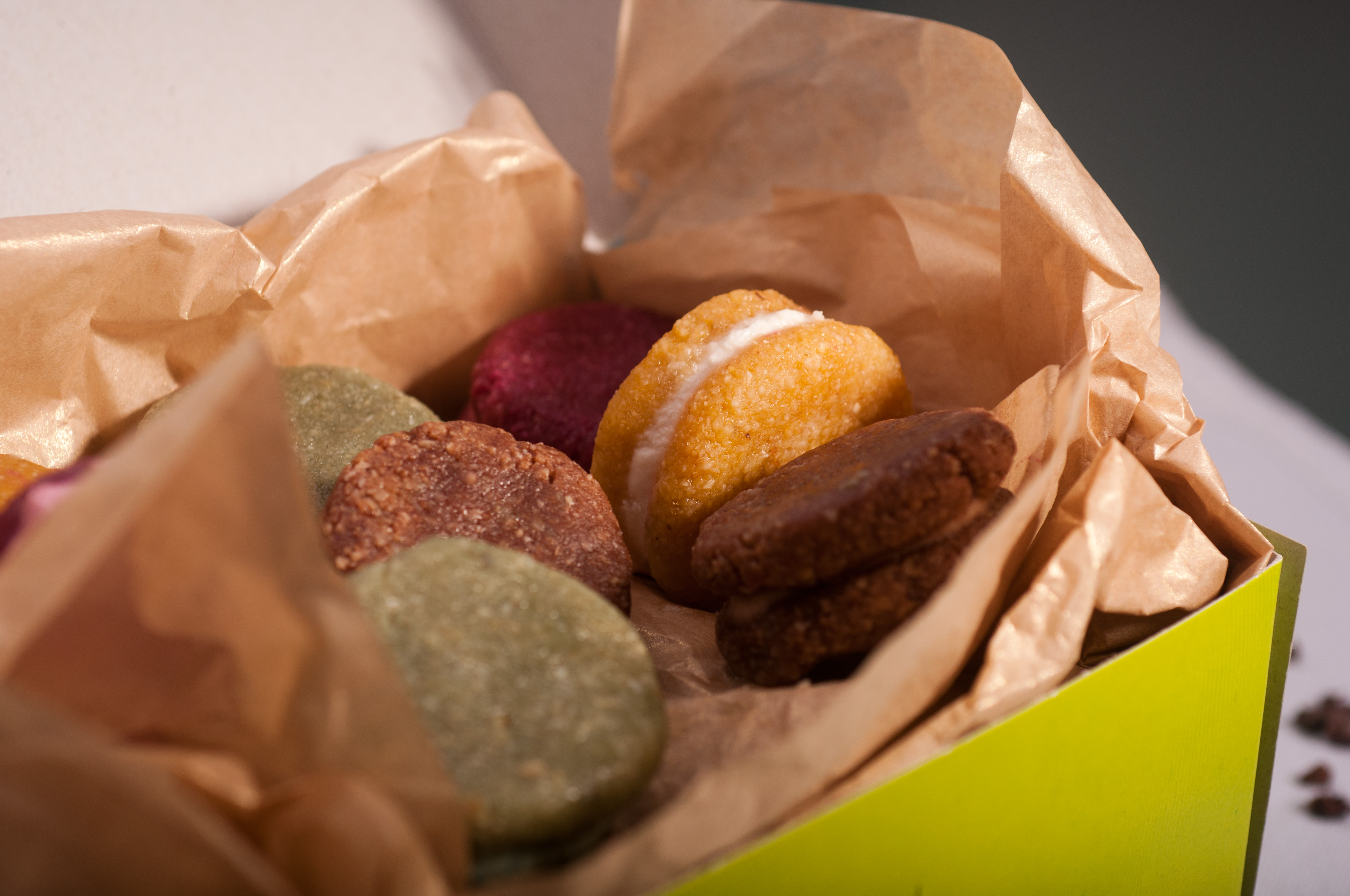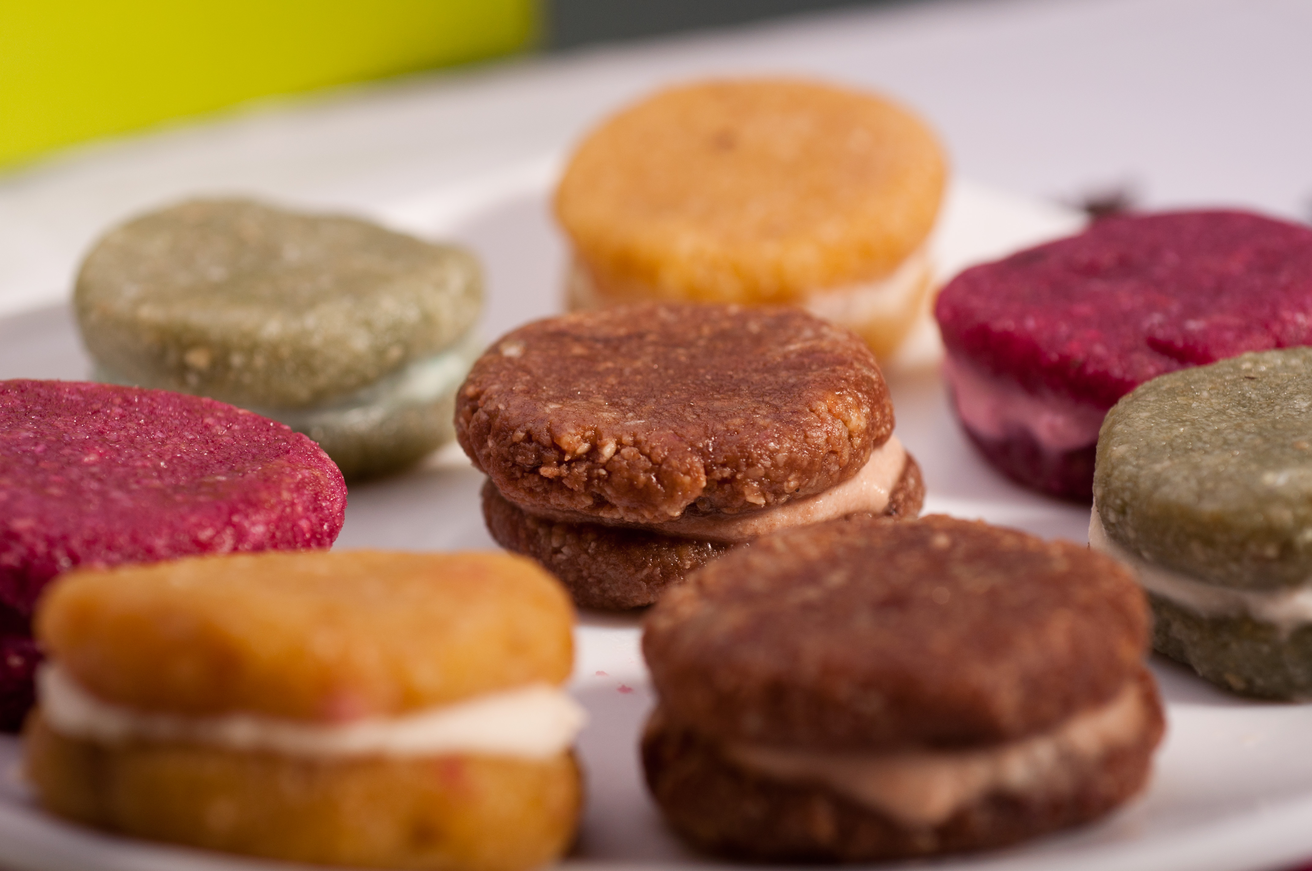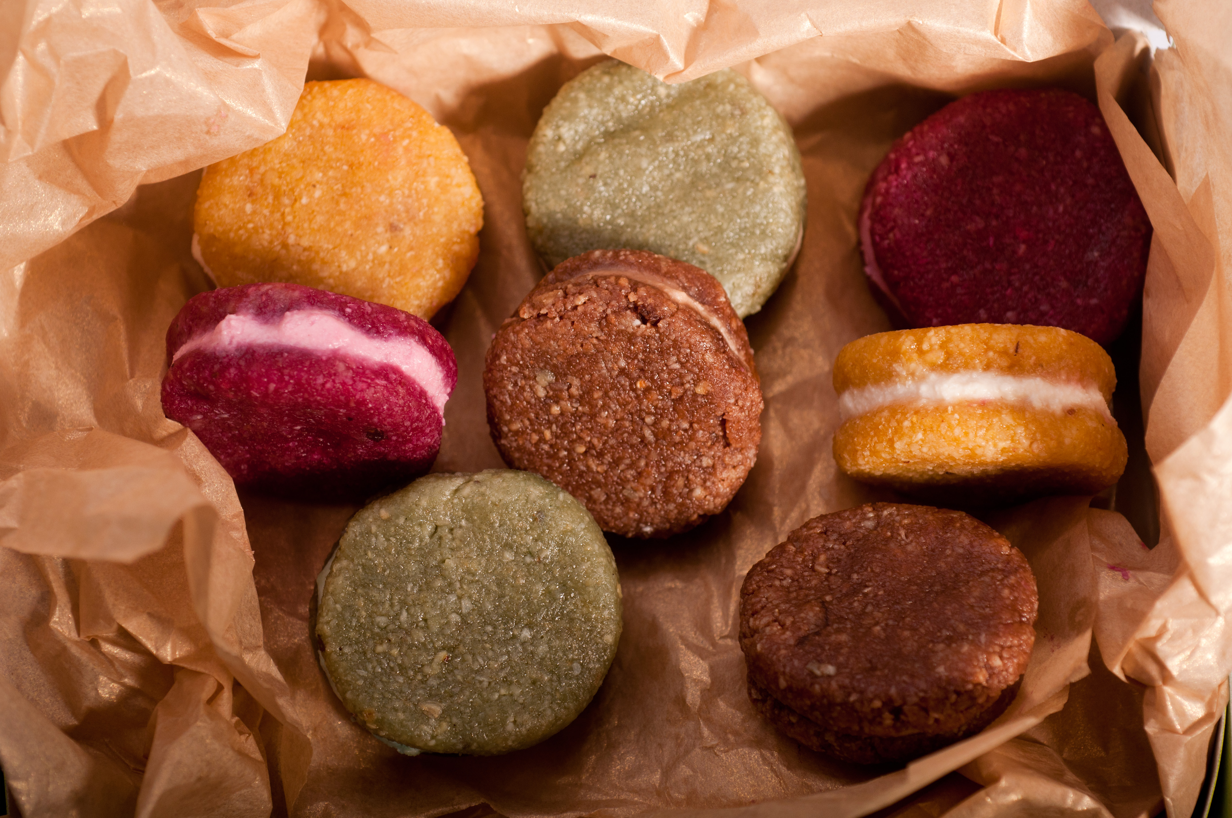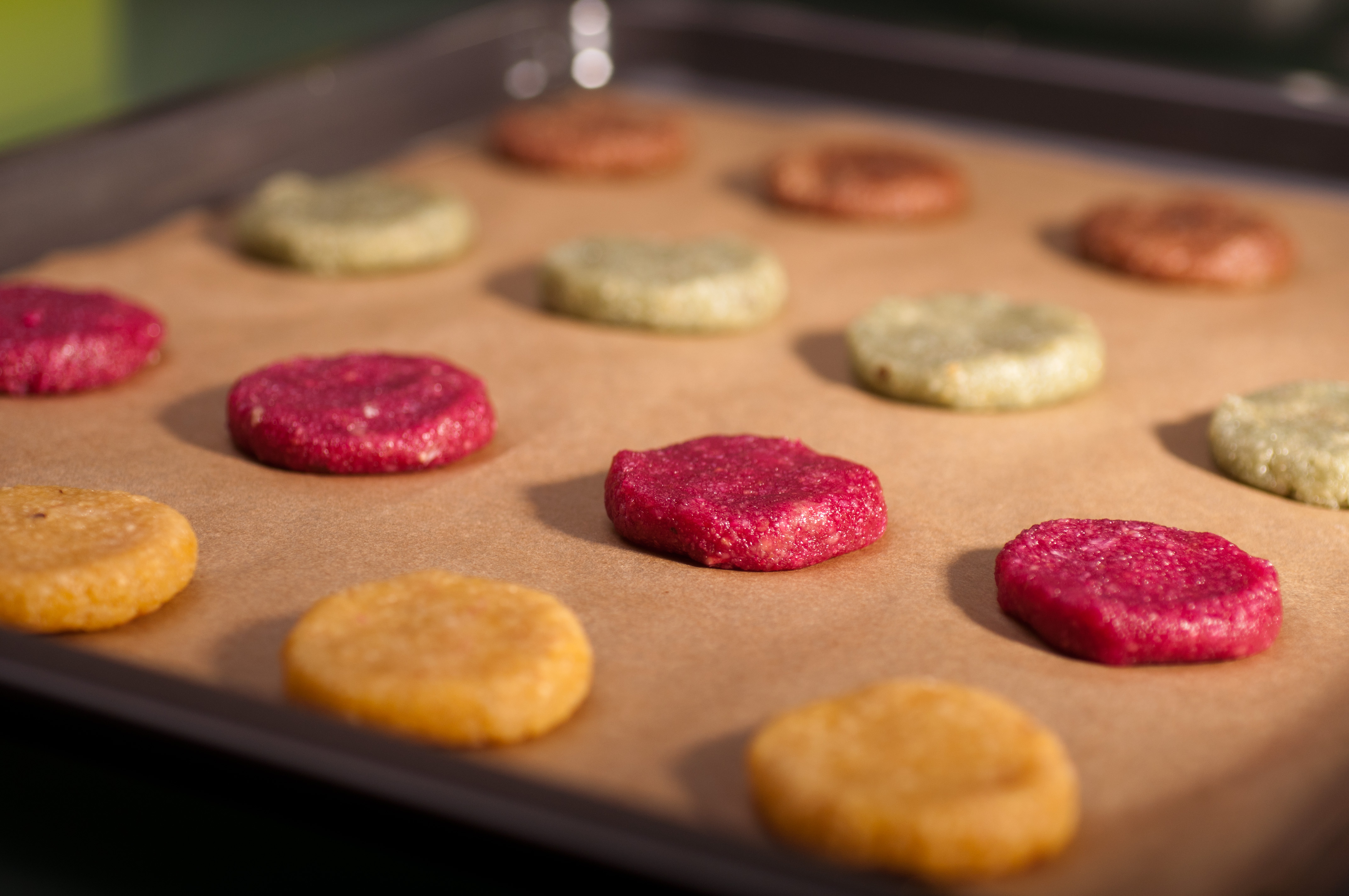 Много харесвам класическите макарони. Харесва ми това, че от вън са твърди, а сърцевината е мека и топяща се в устата. Харесва ми това, че с тях може да експериментираш с всякакви цветове и вкусове. Когато реших да приготвя суровия вариант на този уникален десерт, знаех че едва ли ще успея изцяло да пресъздам вкуса им, но и не беше това целта ми. Исках да направя един вкусен и интересен десерт, който на вид да наподобява така популярните макарони. Както се вижда, тестото за сладките беше нападнато още в началния етап на приготвянето.