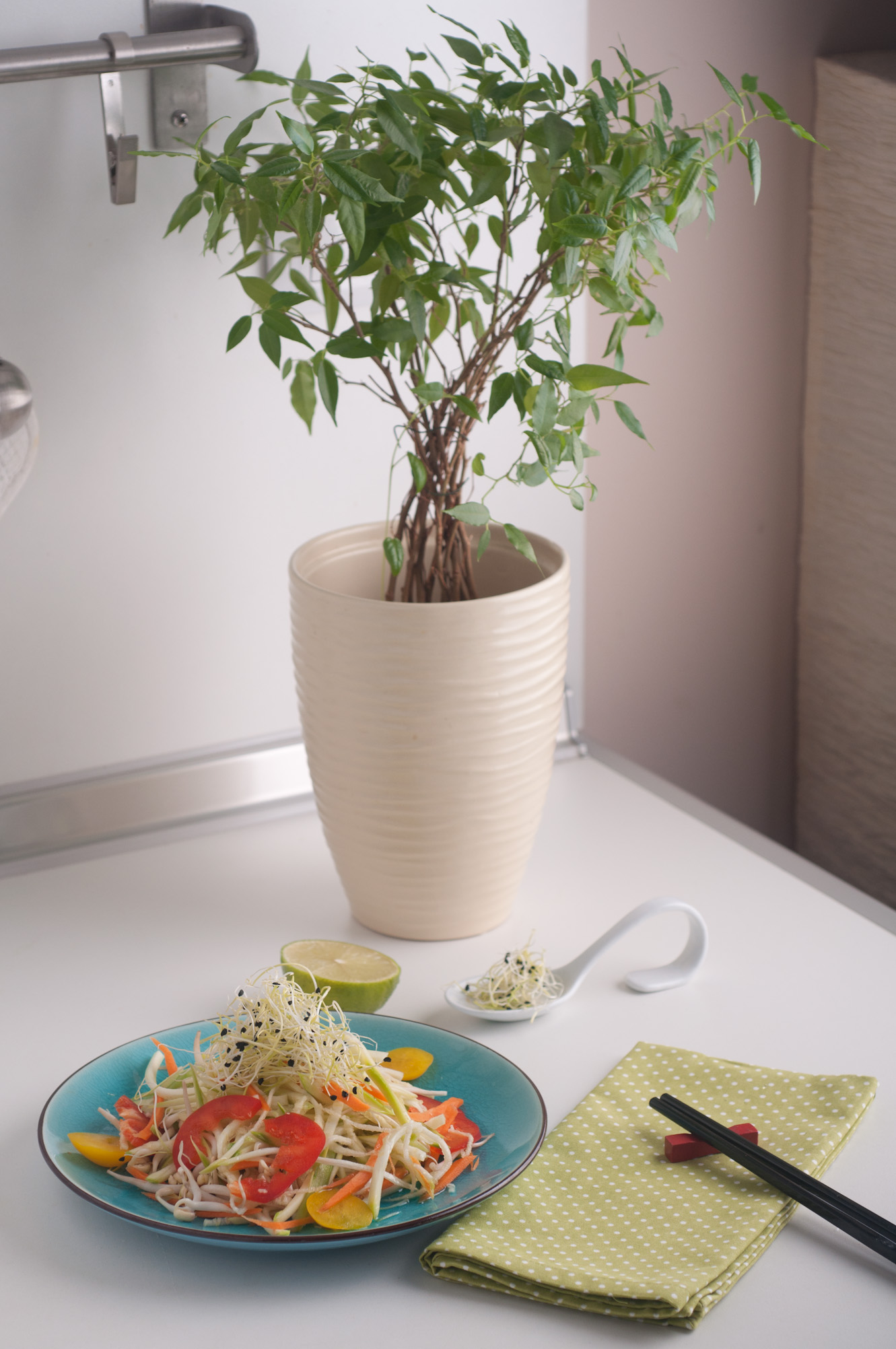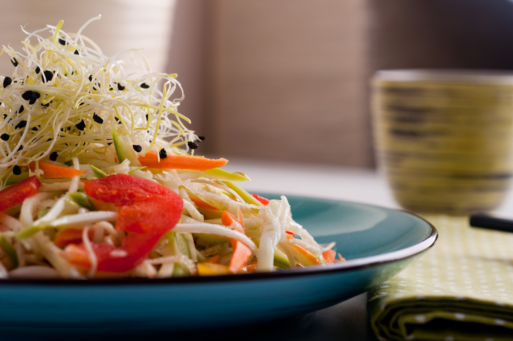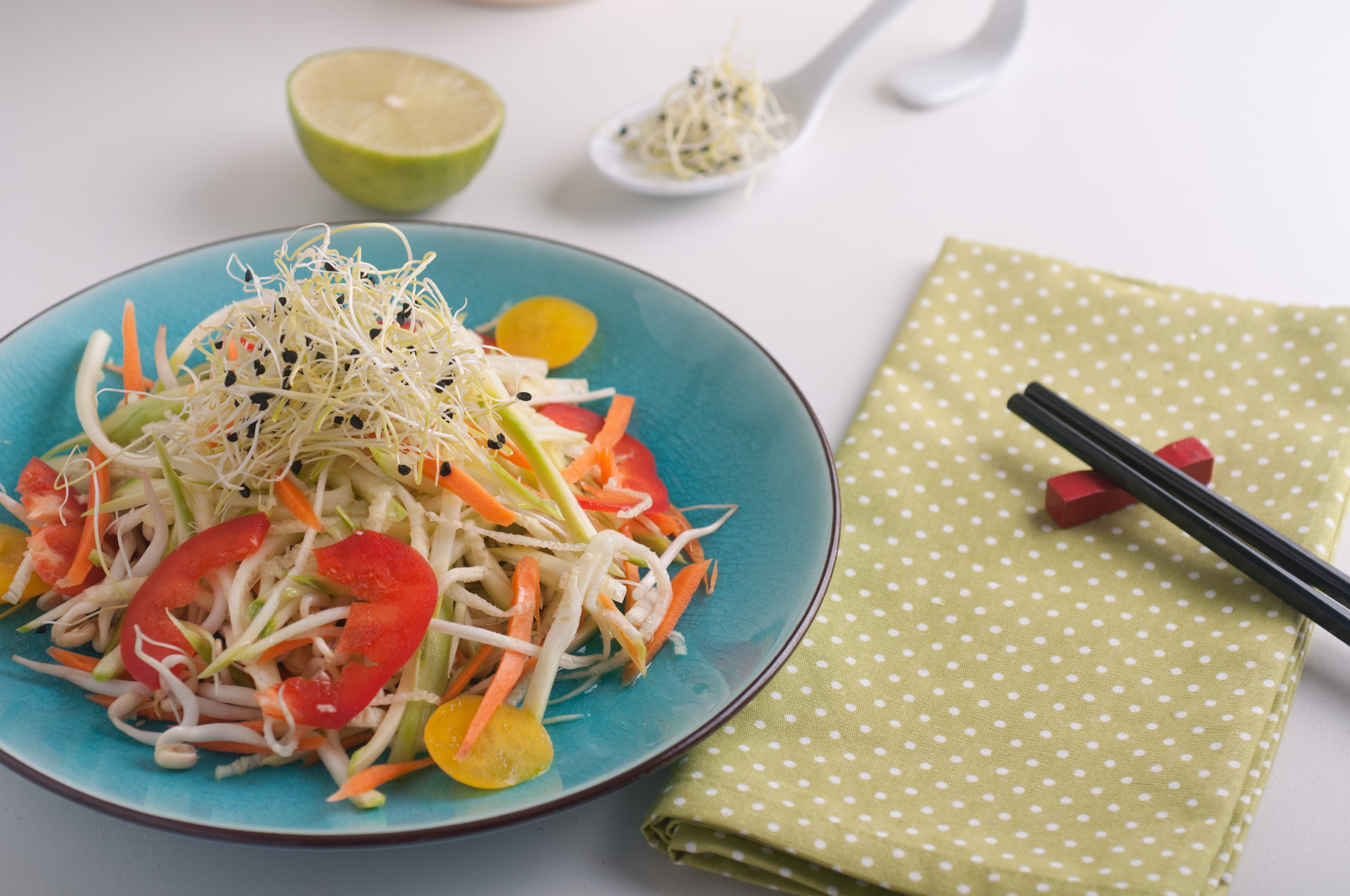 Реших да не използвам оризово фиде, а вместо него нарязах тиквичка на фини жулиени. Използвах ренде-мандолина, но вие може да ги нарежете на кухненски робот или на ръка. Така постигнах илюзията за азиатски нудълс. Дресингът съчетава в себе си подправките, които изникват в съзнанието ми, когато си спомня за вкусовете на Тайланд – чесън, джинджифил, кориандър, люто. Преди няколко години имах щастието да посетя тази уникална страна, затова тези вкусове са ми добре познати. Ще ви разкрия една малка тайна. Въпреки че съм против купуването на сосове и всякакви готови овкусители, има един сос за морска храна с тайландски вкус, който си купувам. Винаги, когато искам да си припомня аромата на Тайланд, слагам по една лъжичка от него. Но ако използвате съставките в рецептата ми за дресинга, няма да имате нужда от него 🙂 Използвах и малко накиснато кашу. Така се получава един наистина плътен и кремообразен вкус. Ако обичате пресен кориандър може да сложите в салатата. Аз лично намирам вкуса му за прекалено силен и затова не съм използвала.