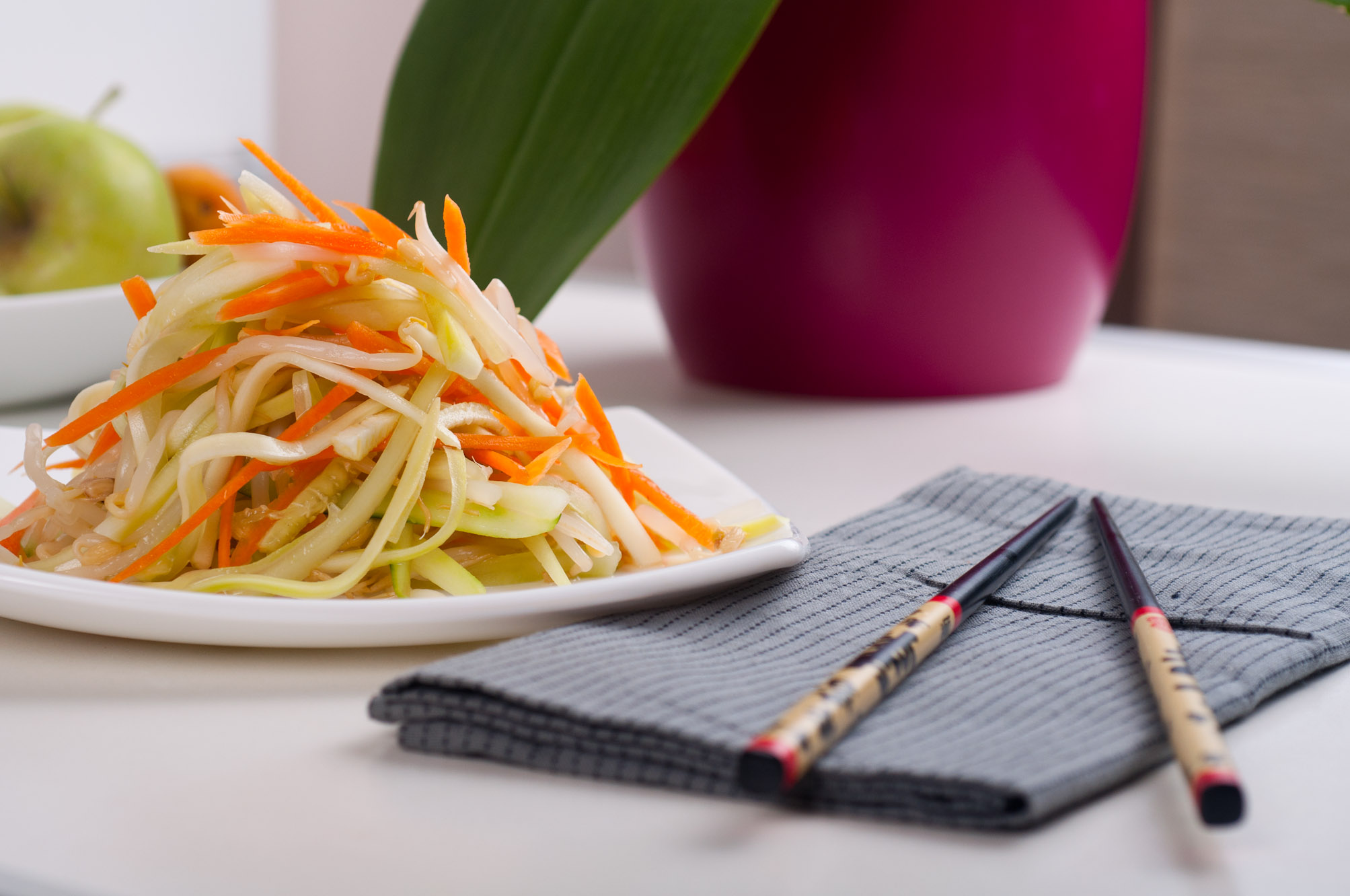Първото е една азиатска салата. Всъщност аз си я кръстих така, понеже има един китайски ресторант в ж.к. Изток, в който готвят покъртително вкусно, без естествено да липсва присъщата за повечето китайски ресторанти мръсотийка 🙂 Та в този ресторант с Христо си поръчваме една салата със соеви кълнове, която представлява просто краставица, морков и соеви кълнове. Това, което я прави наистина вкусна са подправките, с които я овкусяват – оризов оцет, чесън и сусамово олио. Възможно е да има и още нещо, което да не мога да различа. Още преди няколко години, реших да си направя такава салата вкъщи. При първия опит се получи вкусна салата, но и липсваше нещо. Установих, че това, което придава автентичния вкус на тази салата е сусамовото олио. Тогава успях да си намеря само олио от препечен сусам. Сега имам вече и студено пресовано, но дори върли суровоядци като Ani Phyo, използват термично обработеното сусамово олио защото има по-интензивен вкус.
