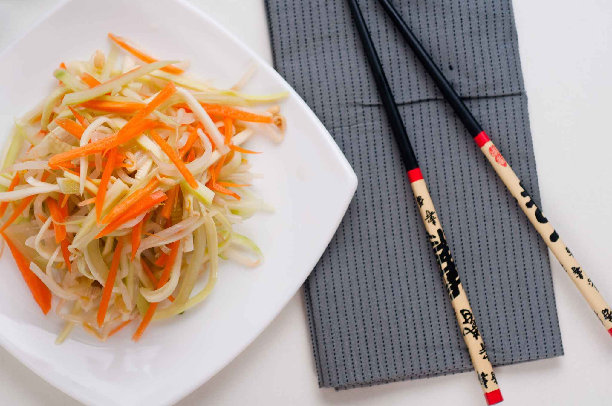 Всички зеленчуци за салатата се нарязват на тънки лентички и се поставят в чиния или купа. Чесъна и джинджифила се накълцват много на ситно и се поставят в малка купичка. Към тях се добавят останалите съставки на дресинга и се разбърква добре. Салатата се залива с готовия дресинг.