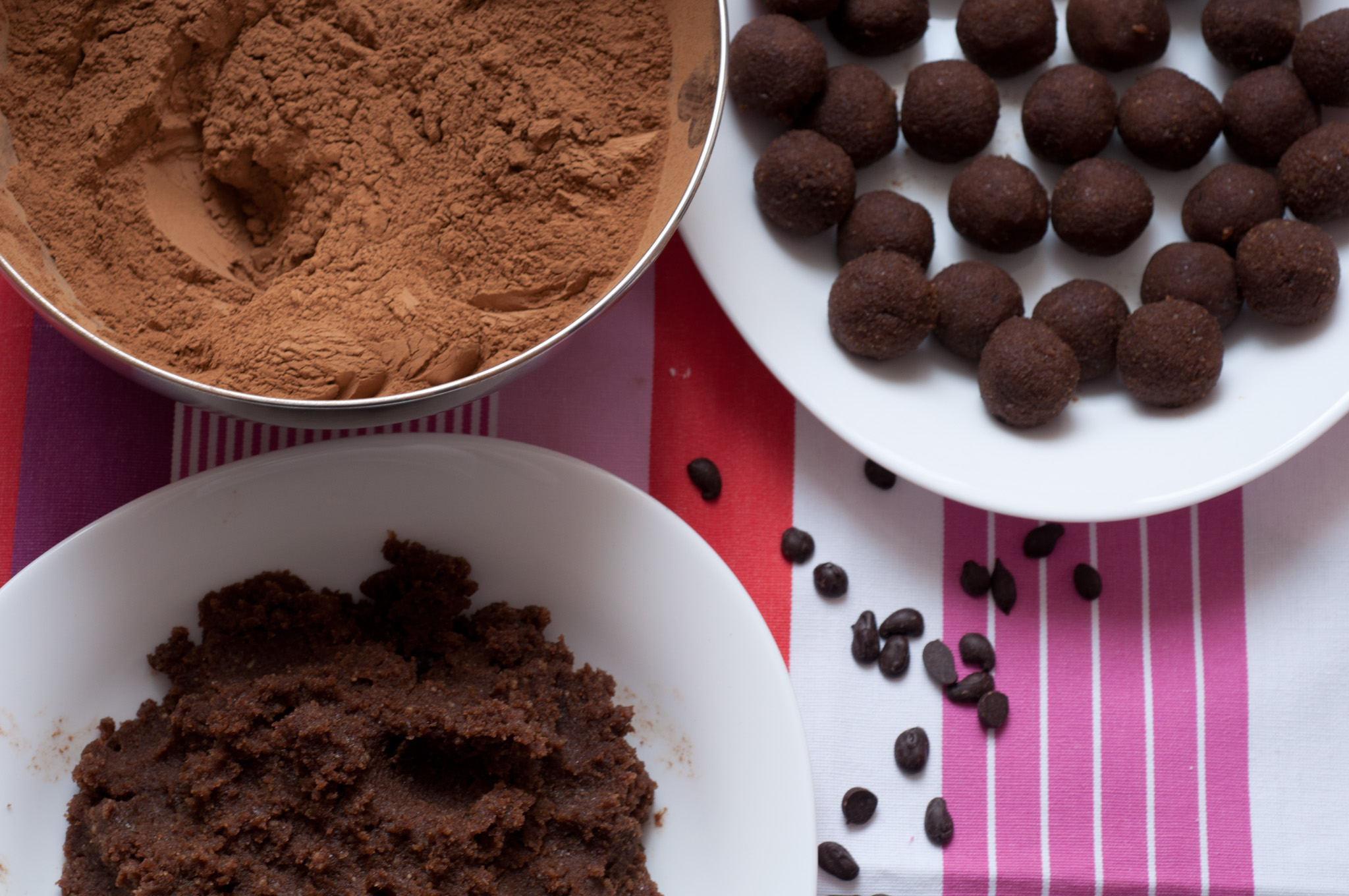 Всичко се омесва в кухненски робот до получаването на меко тесто. Важно е първо да смелите сухите ядки и едва след това да добавите мокрия пулп (ако използвате такъв) и останалите течни съставки и фурмите. От тестото се омесват малки топчета, които може да оваляте в кокос, брашно от рожкови, какао или семена и ядки по ваш избор. На мен ми се получиха около 40 бонбона.