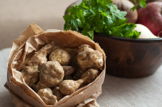 От години в семейството ми сме свикнали, зимните месеци салатите ни да са основно от кореноплодни – цвекло, ряпа, алабаш, моркови, целина. Рецептата, която искам да ви покажа е с един малко популярен у нас корен – земна ябълка или известна още като топинамбур, йерусалимски артишок, слънчев корен или конска ябълка. Казвам малко популярен, просто защото за първи път видях да се продава едва тази зима на зеленчуковия щанд в един био-магазин. Предполагам, че може да се открие и на някой пазари, но в общи линии, ако не си го отглеждате или нямате познати, които да ви снабдяват с него, ще ви е малко трудно да се възползвате от полезните му качества. Сигурно ще попитате, защо ви показвам рецепта с един толкова екзотичен корен? Ами просто защото искам да представя многообразието и възможностите, които природата ни предлага дори и през зимата.