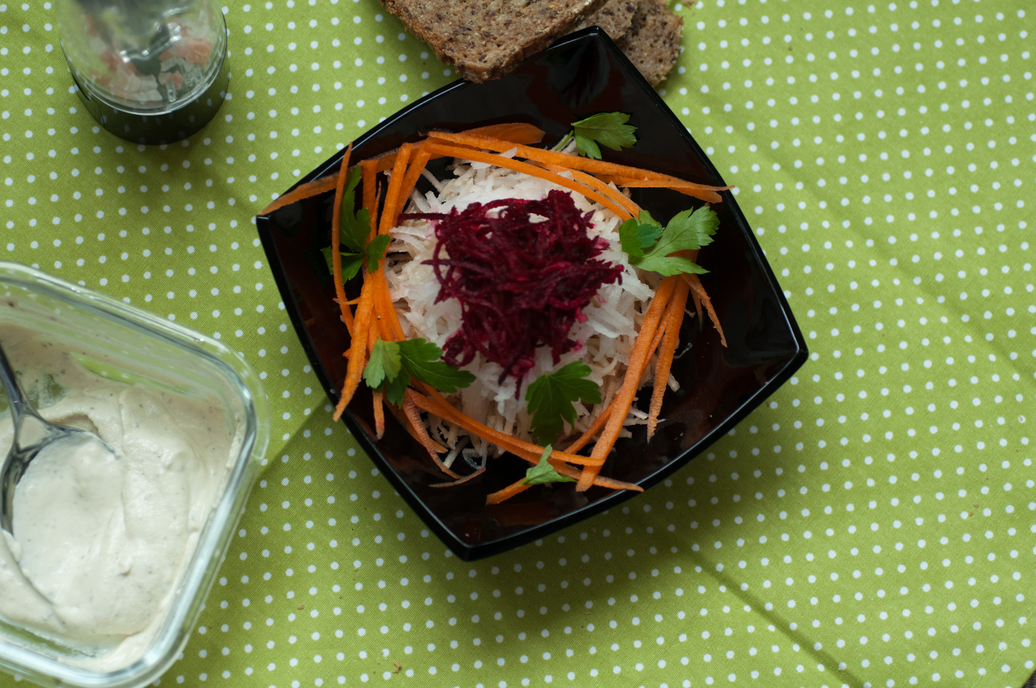 Няма да давам рецепта за тази салата, защото няма нужда от такава. Хубавото й е, че може да се приготви от всякакви кореноплодни, каквито имате под ръка. Някой може да добавят и ябълка за по-свеж вкус. В случая съм използвала: земна ябълка, ряпа Дайкон (дългата бяла ряпа), червено цвекло, морков. Дресинга направих с малко сол, зехтин и чудесния домашен ябълков оцет, който баща ми прави.