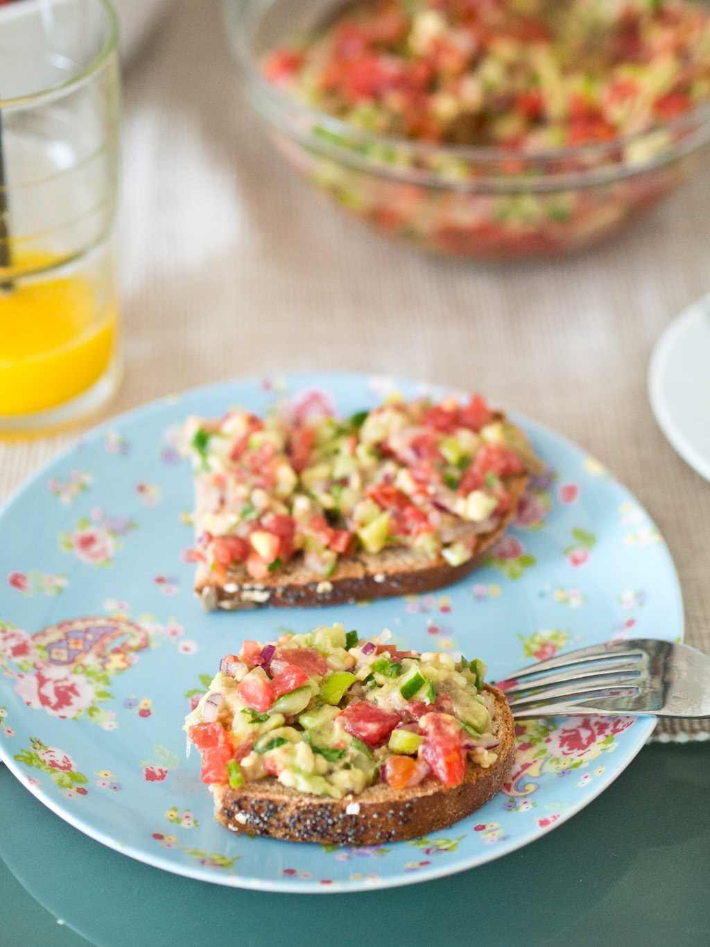 Първата представлява много вкусна Зеленчукова салца, която може да се хапва върху пълнозърнест хляб. Основните съставки са: домати, авокадо, лук, чушка, краставица, магданоз. Всичко се нарязва на много малки кубчета, добавя се лимонов сок и малко сол.