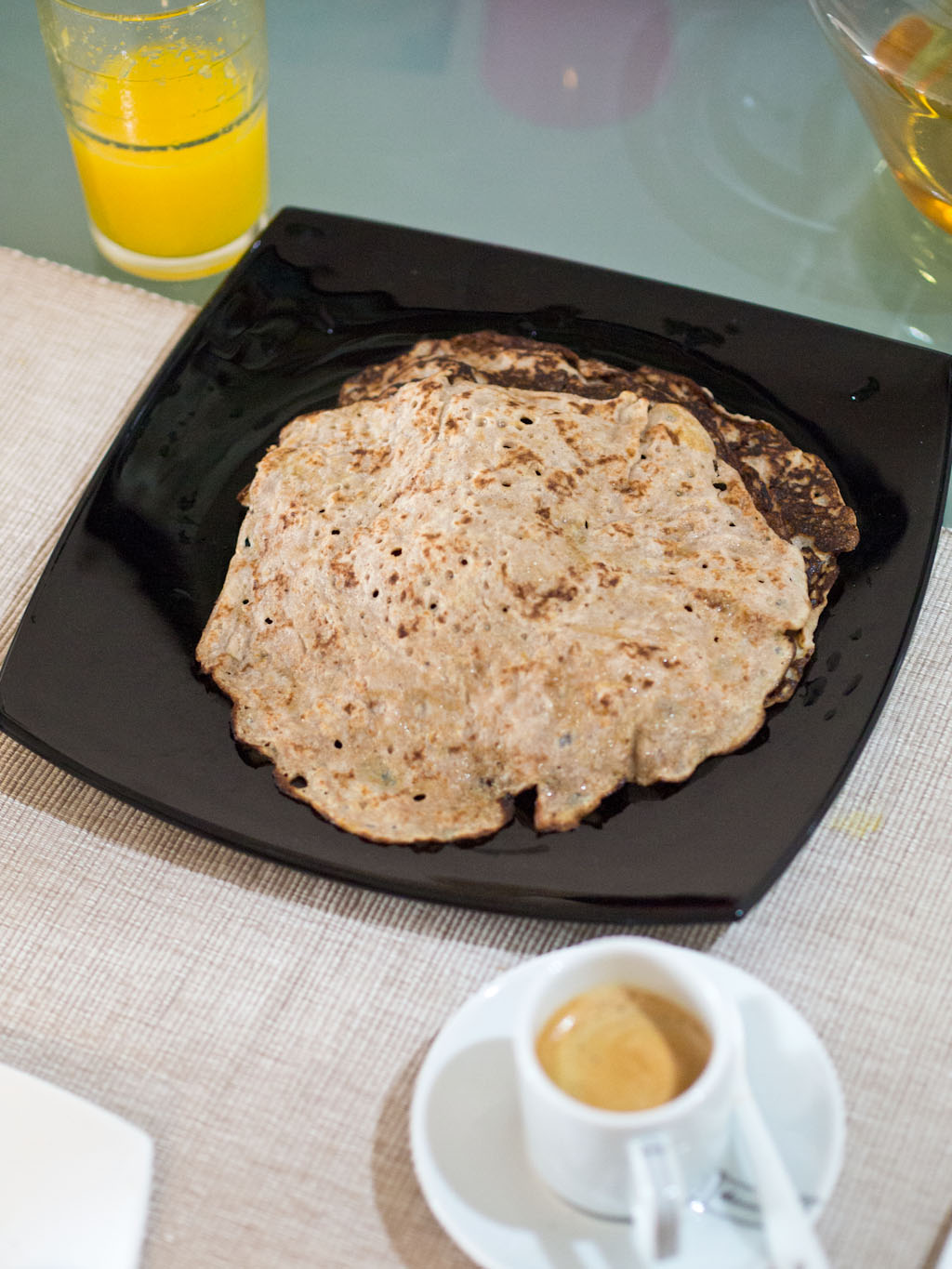 Но да се върнем на закуската. Денят ни започва с прясно изцеден сок от портокал. Към него добавяме спирулина или хлорела. Христо пие неговия сок с директно разтворена в него спирулина, а тъй като на мен ни ми допада особено вкуса на хлорелата я пия на таблетки със сока. Децата също много харесват таблетките спирулина и хлорела и пият по една с техния сок. Основната ни закуска през седмицата най-често е овесена каша с плодове, кус-кус сварен с малко оризово мляко, пълнозърнест флейкс от елда с оризово или овесено мляко. За уикендите и дните, в които не бързаме за работа или градина обаче си приготвяме по-богати закуски, като двете, които искам да ви представя.